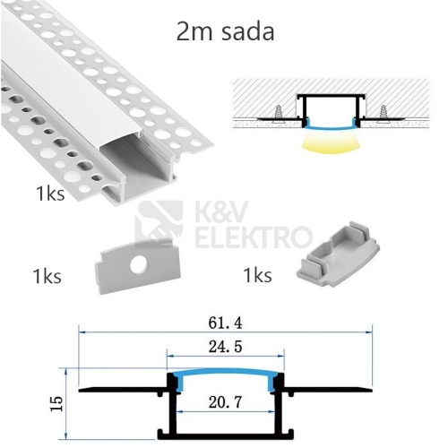 Sada lišty pro LED pásy KM81-S-MK-P 2m ve stříbrném barevném provedení určená pro montáž do sádrokartonu, o rozměrech 61,4x15x2000mm. Balení obsahuje: 1ks hliníkové lišty o délce 2m, 1ks matný difuzor o délce 2m, 1ks koncovky bez otvoru, 1ks koncovky s otvorem. Lišta se rozměrově vejde do tloušťky sádrokartonu a není třeba při montáži dávat pozor na rozmístění nosné konstrukce sádrokartonu.