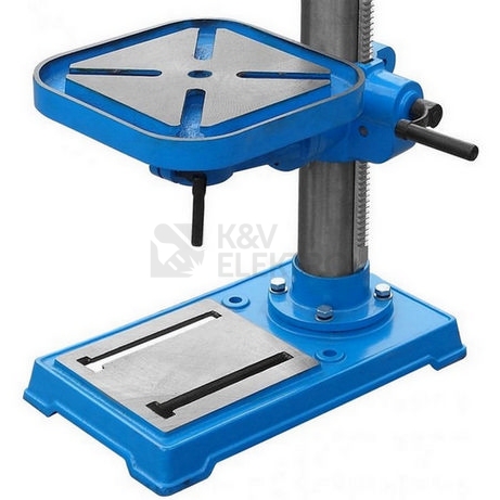 Konstrukce: ocelové řemenice (3), vřeteno s kónickým úchytem/přesnými kuličkovými ložisky, kuželový trn MK2, masivní vrtací stůl (-> d x š: 260 x 260 mm; s příčnými drážkami pro upevnění svěráku), stojná deska z litiny (-> d x š: 240 x 410 mm, včetně vývrtů pro stacionární ukotvení vrtačky).