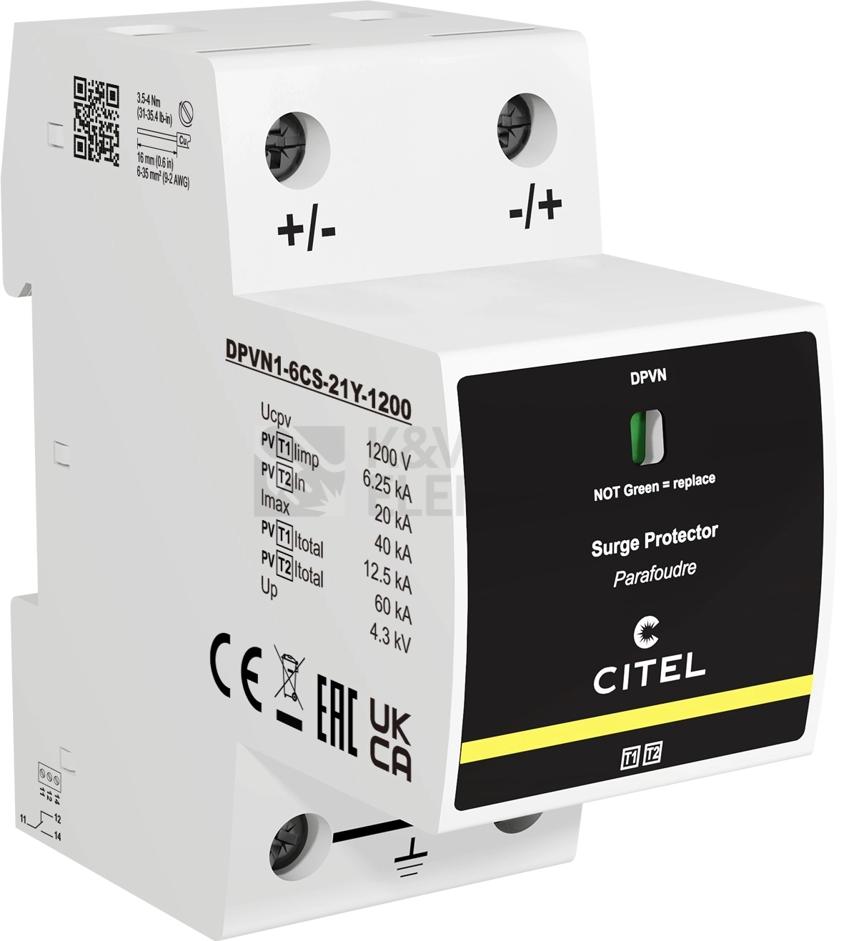 Ochranné vlastnosti zahrnují celkovou úroveň omezení na 6 kV, přičemž mezi vodiči DC+ a DC- i vůči ochrannému vodiči jsou k dispozici úrovně 4,3 kV (DC+ / DC- – PE). Pro připojení se hodí vodiče až do průřezu 35 mm² v případě tuhých (jedno‑ i vícedrátových) a do 25 mm² u pružných lanek, což usnadňuje volbu kabeláže v rozvaděči.