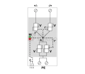Tento kombinovaný svodič je určen k ochraně fotovoltaických stringů v rozvaděčích, kde je požadována prověřená odolnost dle typu 1 a 2. Uspořádání vychází z dvoupólového řešení a zvládá bleskové impulzy s hodnotou 12,5 kA (10/350). Pro nasazení v PV aplikacích je určeno jmenovité stejnosměrné napětí 1 000 V, přičemž provoz je možný až do 1 200 V DC, které zároveň odpovídá maximálnímu PV napětí 1 200 V.
