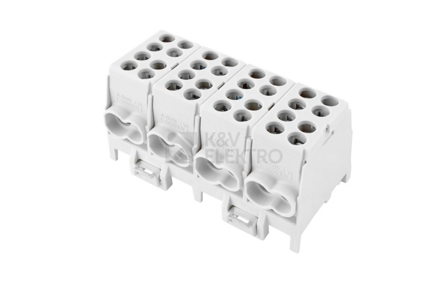 Svorkovnice rozbočovací HLAK 25-4/8 GR-S, 100A, 4pól., AL/CU, IP20, 4xŠ, na DIN /2080430.Univerzální rozbočovací (smyčkovací) svorkovnice HLAK typ M2 mohou být použity v rozváděčích nízkého napětí či v dalších aplikacích, kde potřebujeme připojit vstupní kabel a kabel(y) výstupní (smyčkování) a zároveň připojit k napájení přístroje osazeného uvnitř rozváděče. Speciální povrchová úprava svorky umožňuje připojení jak měděných tak hliníkových vodičů. Svorky jsou určeny pro montáž na nosnou lištu (DIN) a jsou řaditelné do sebe. Vodiče se do svorek po odizolování připevňují pomocí šroubového spojení. Šroub dosedá přímo na vodič, proto je nutné jemně slaněné vodiče opatřit dutinkou. Dutinka ale zvětší průřez vodiče a proto je nutné připojovat slaněné vodiče o řád menší než uvedené průřezy. U pevných vodičů toto není nutné.Hlavní přednosti:• Montáž na nosnou lištu• Ui až 1000 V AC/DC (ČSN EN 60998-1 ed. 2)• Menší rozměry oproti klasickým rozbočovacím svorkám• Krytí IP20• Připojení měděných i hliníkových vodičů• Řaditelné do sebe• Široká nabídka typů a provedení• Barevné odlišení fází, nulového a ochranného vodiče