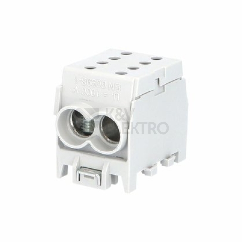 Svorkovnice rozbočovací HLAK 70 1/2 M2, 250A, 1pól., AL/CU, IP20, šedá, na DIN /2080147.Univerzální rozbočovací (smyčkovací) svorkovnice HLAK typ M2 mohou být použity v rozváděčích nízkého napětí či v dalších aplikacích, kde potřebujeme připojit vstupní kabel a kabel(y) výstupní (smyčkování) a zároveň připojit k napájení přístroje osazeného uvnitř rozváděče. Speciální povrchová úprava svorky umožňuje připojení jak měděných tak hliníkových vodičů. Svorky jsou určeny pro montáž na nosnou lištu (DIN) a jsou řaditelné do sebe. Vodiče se do svorek po odizolování připevňují pomocí šroubového spojení. Šroub dosedá přímo na vodič, proto je nutné jemně slaněné vodiče opatřit dutinkou. Dutinka ale zvětší průřez vodiče a proto je nutné připojovat slaněné vodiče o řád menší než uvedené průřezy. U pevných vodičů toto není nutné.Hlavní přednosti:• Montáž na nosnou lištu• Ui až 1000 V AC/DC (ČSN EN 60998-1 ed. 2)• Menší rozměry oproti klasickým rozbočovacím svorkám• Krytí IP20• Připojení měděných i hliníkových vodičů• Řaditelné do sebe• Široká nabídka typů a provedení• Barevné odlišení fází, nulového a ochranného vodiče