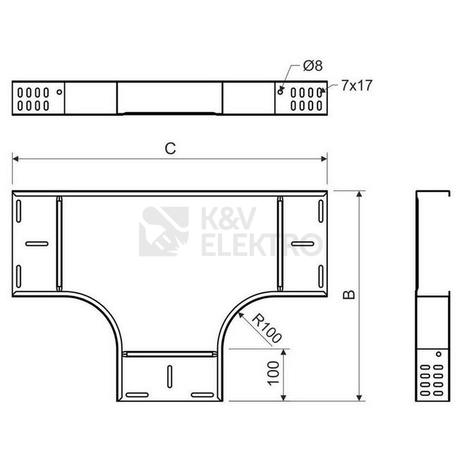 T kus pro odbočení ve tvaru T pro kabelové žlabu rozměru 110x150, vhodné pro povrchovou úpravu žlabů v povrchové úpravě sendzimir