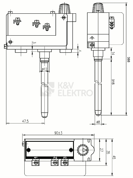 Rozměry termostatu jsou: délka t (+/- 3mm): 388 mm; délka stonku (+/- 3mm) 315mm.