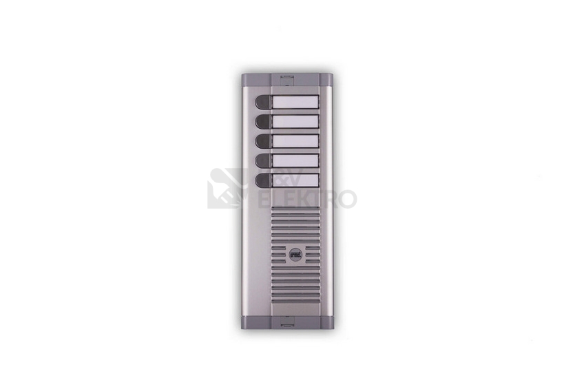 Tlačítkový panel s prostorem pro hlasovou jednotku řady 925 s 5 tlačítky v 1 sloupci. Včetně instalační krabice pod omítku. Panely jsou tvořeny poměrně silnou čelní deskou z eloxovaného hliníku, zakončenou na horní a dolní straně plastovými lištami. Pro osazení analogovými hlasovými jednotkami 1128/500 (4+n), 1128/510 (4+n), 1035/67 (1+n) a digitální jednotkou 1083/8 (2VOICE).