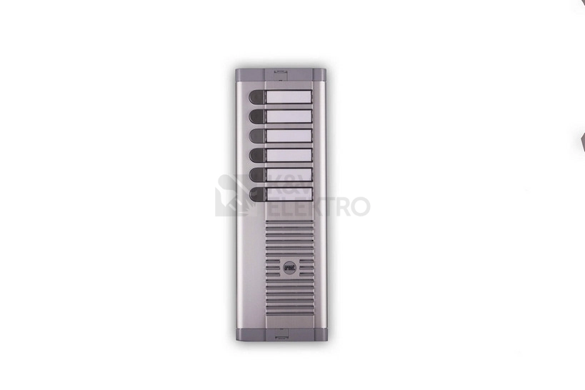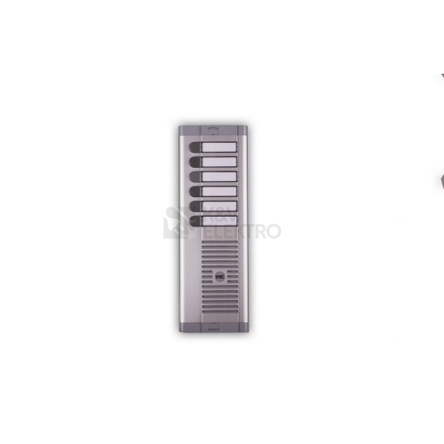 Tlačítkový panel s prostorem pro hlasovou jednotku řady 925 se 6 tlačítky v 1 sloupci. Včetně instalační krabice pod omítku. Panely jsou tvořeny poměrně silnou čelní deskou z eloxovaného hliníku, zakončenou na horní a dolní straně plastovými lištami. Pro osazení analogovými hlasovými jednotkami 1128/500 (4+n), 1128/510 (4+n), 1035/67 (1+n) a digitální jednotkou 1083/8 (2VOICE).