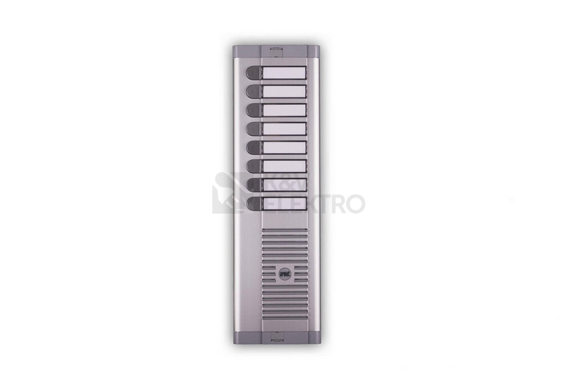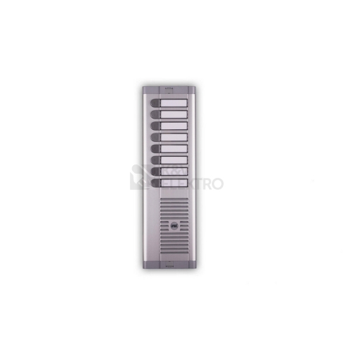Tlačítkový panel s prostorem pro hlasovou jednotku řady 925 s 8 tlačítky v 1 sloupci. Včetně instalační krabice pod omítku. Panely jsou tvořeny poměrně silnou čelní deskou z eloxovaného hliníku, zakončenou na horní a dolní straně plastovými lištami. Pro osazení analogovými hlasovými jednotkami 1128/500 (4+n), 1128/510 (4+n), 1035/67 (1+n) a digitální jednotkou 1083/8 (2VOICE).