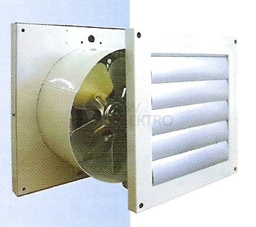 pracuje v poloze vodorovně s osou hřídele. Musí být zabudován tak, aby byla vyloučena možnost náhodného dotyku s jeho rotujícími částmi. Při montáži ventilátoru na zeď se doporučuje dodržet vzdálenost ventilátoru od podlahy minimálně 2,3m. Pokud je nutno ventilátor umístit níže, nebo je ventilátor v dosahu ruky ( např. schodiště ) musí být zamezen přístup k oběžnému kolu ventilátoru ochranným košem. Žaluzie ventilátoru se upevňují na zeď pomocí šroubů a hmoždinek, pro které jsou v rámu vyvrtány upevňující otvory. Tloušťka zdi, na kterou se ventilátor může namontovat, musí být minimálně 220mm. Při menší tloušťce zdi by ventilátor přečníval na vnější straně zdi, čímž by byly znemožněna montáž žaluzií. Připojení ventilátoru na elektrický rozvod, případně jeho opravy, musí provádět osoba odborně znalá.
