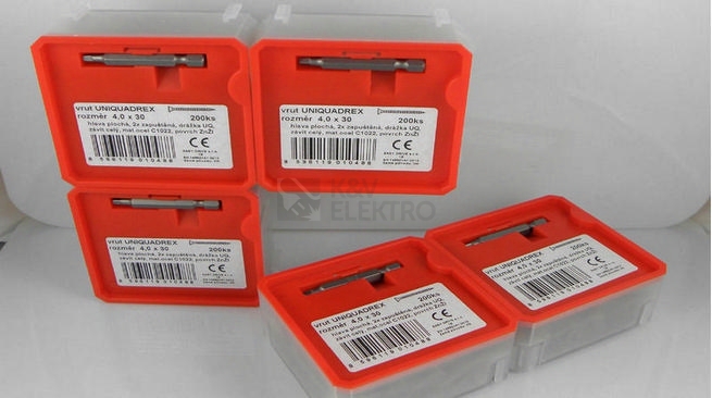 Vruty Uniquadrex se zapuštěnou hlavou mají UNIQUADREX drážku pro speciální bitový nástavec, který je součástí balení. Mají ale i křížkovou drážku pro povolení, když není tento bit k dispozici. Jsou dlouhé 70 mm s průměrem 5 mm. Prodávají se po 55ti kusech.