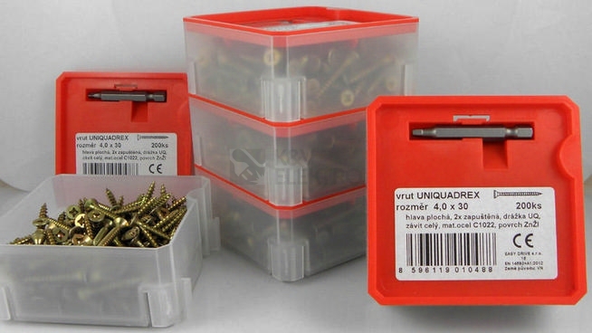 Vybírejte z vrutů Uniquadrex které vynikají výbornou drážkou, která kombinuje speciální čtyřhran pro lepší šroubování dodaným bitem, tak běžný křížový systém.