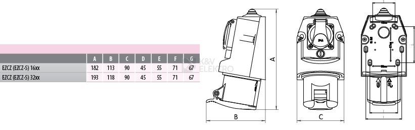 Průmyslová zásuvka, EZCZ 3253, Stupeň krytí IP IP44, Počet pólů 3+N+PE, Jmenovitý proud (A) 32, Un (V) 400/230, Typ (zásuvka / zástrčka) Kombinované zásuvky