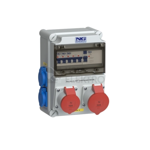 - Zásuvky: 1x 32A/400V/5p, 1x 16A/400V/5p, 4x 230V s ochr. kolíkem (česká)