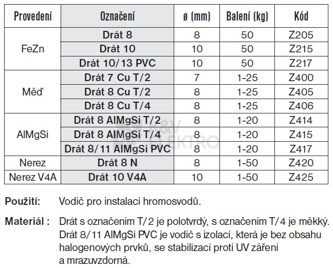 Specifikace zemnícího drátu TREMIS AlMgSi 8 T/2 polotvrdý, Z414