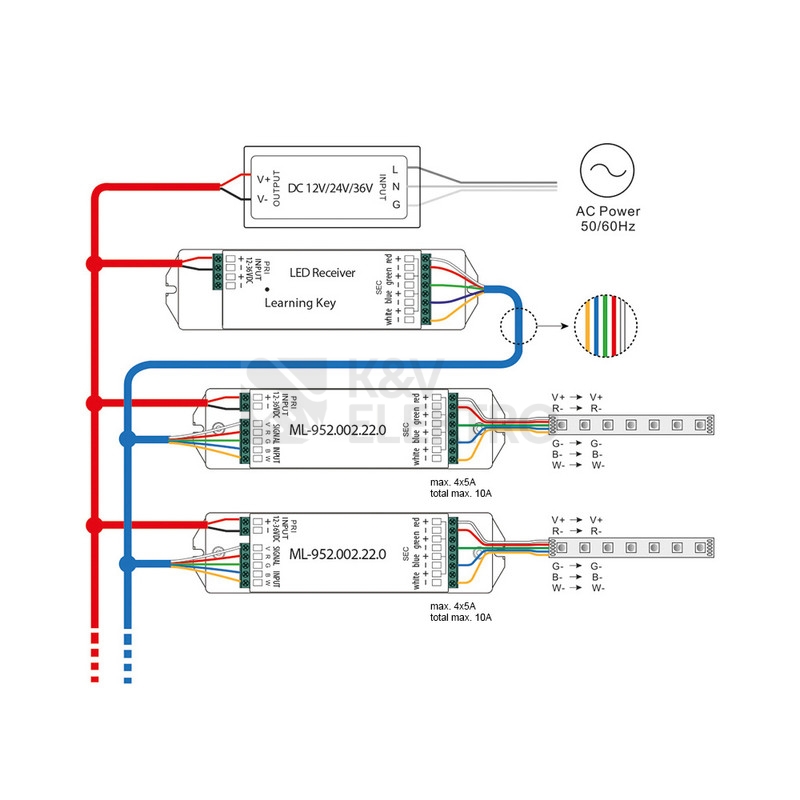 RGBW zesilovač pro jednobarevné, CCT, RGB a RGBW LED pásky. Připojuje se za RF přijímač a umožňuje synchronní řízení dlouhých úseků LED pásků pomocí jediného ovladače (není součástí), PWM signál. Rozměry: 178x46x22mm. Vstupní napětí: DC 12-36V. 4 kanály s max. zátěží 5A na 1 kanál (= jedna barva R/G/B/W): 60W/12V, 120W/24V, 180W/36V na kanál. Celková max. zátěž 10A: 120W/12V, 240W/24V, 360W/36V.